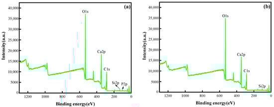 XPS full spectra of limestone samples in different concentrations of phosphate solutions. (a) XPS full spectrum of limestone samples in 100 mg/L phosphate solution; (b) XPS full spectrum of limestone samples in 2 mg/L phosphate solution.