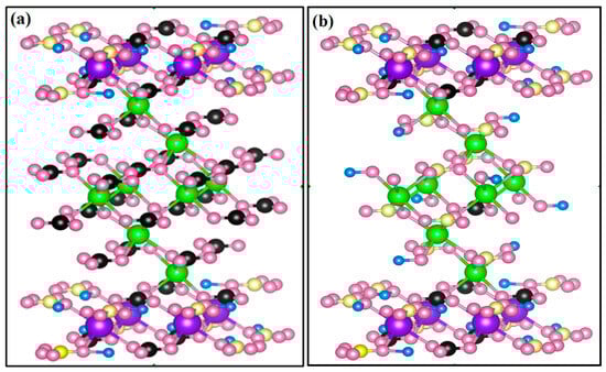 The common crystal structure of calcium carbonate is the cubic densest stacking of CO32− ions, with Ca2+ ions filling the octahedral voids between the CO32− ions; magnesium carbonate consists of four oxygen atoms and one magnesium atom arranged in a positive octahedral arrangement, and thus calcium carbonate is of the same octahedral ligand structure as magnesium carbonate. The experimentally produced CaHPO4 and Mg2PO4(OH) possess different crystal properties from those of magnesium carbonate and calcium carbonate. Therefore, XRD, infrared spectroscopy, and Raman spectroscopy were used in the experiments. Although the principles of the three detection methods are different, all of them are able to reflect the elemental composition and crystal structure of the solid phase through the molecular structure and vibration modes of the molecular groups inside the solid phase. XRD analysis shows that the main mechanism of adsorption is surface precipitation, which occurs when the concentration of each component in the precipitate exceeds the solubility product of the precipitate. This reaction usually occurs rapidly and is irreversible []. The infrared spectra of limestone involved in the reaction in 100 mg/L, 2 mg/L, and deionized water were found to be basically the same as the peaks of the initial sample of limestone in Figure 6, and no new peaks appeared, which indicated that the solid-phase interior was still dominated by limestone, and the crystal structure was still an octahedral ligand. Figure 7 demonstrates the Raman spectra of the limestone of each experimental group, and all three of them show spectral peaks at 149 cm−1, 275 cm−1, which is due to the alternating distribution of Ca2+ and Mg2+ in the limestone, and the appearance of two external vibrational modes (translational T and rotational L) [], and at the same time the three of them are also basically the same in the position of the other peaks, which once again suggests that the solidus interior is dominated by the limestone, and the crystal structure is an octahedral allotrope. Then, according to the analytical results of XPS characterization tests, another mechanism of adsorption of phosphate by limestone is mainly the intrasphere complexation through the ligand exchange process [], in which the hydroxyl group in limestone introduces covalent chemical bonding between the phosphate ions and the calcium and magnesium cations on its surface, releasing other anions previously bound to the calcium and magnesium ions, e.g., CO32− []. Thus, phosphate ions can form inner-sphere complexes on limestone surfaces that are less affected by changes in ionic strength due to direct coordination with surface groups []. The inner-sphere coordination is composed of several phosphate molecules connected to a metal atom with three oxygen bonds, which is one of the most important factors determining the behavior during adsorption. Therefore, based on the ligand exchange mechanism and the calculation methods available [], in order to be able to observe the micro-mechanism of phosphate adsorption on limestone more intuitively, the formation of CaHPO4 and Mg2PO4(OH) via phosphate adsorption on the Ca or Mg position of carbonate rock was simulated using VESTA crystal modeling software (https://jp-minerals.org/vesta/en/, accessed on 28 August 2023), as shown in Figure 13. In addition, according to the analysis of water chemistry conclusions, another important factor of the adsorption mechanism is ion exchange; when an anion in the solution is absorbed by limestone, its original anion will be released into the solution in equal amounts to maintain the electrically neutral state of the whole aqueous solution [].