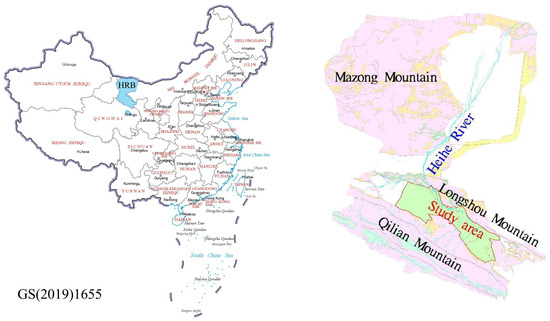 Located in the middle section of the Qilian Mountains and Hexi Corridor, The Heihe River Basin is the second-largest basin of the most arid inland river basin in China, bounded by the Dahuangshan Mountain in Shandan County of Zhangye City in the east and the Black Mountain in Jiayuguan City in the west, bordering the Shiyang River Basin and the Shule River Basin. It covers the Qilian Mountain Watershed in the south to the terminal Juyanhai Lake in the north, with a basin area of 22.25 × 104 km2 (Figure 1).