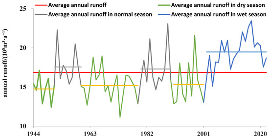 The observation section of the runoff from the Heihe River is the Yingluoxia hydrological station (Figure 2), and the multi-year runoff dynamics of this station show the characteristics of alternating dry-flat-dry-flat-dry-abundant (Figure 2). The period from 1990 to 2022 is a dry period up to 33 years, of which 1990–2001 is a dry period and 2002–2022 is a flood period, which is very typical. The multi-year dynamic changes in the difference between the runoff of Yingluoxia and the runoff of Zhengyixia in the Heihe River roughly reflect the change in water consumption scale in the middle basin, dominated by agricultural irrigation.