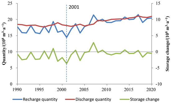 Under the combined influence of natural conditions and human activities, the average annual recharge of groundwater in the study area from 1990 to 2020 was 17.98 × 108 m3/a, the average annual discharge was 18.62 × 108 m3/a, and the difference between recharge and discharge was −0.64 × 108 m3/a. The total groundwater storage change was −19.99 × 108 m3, of which the groundwater storage change from 1990 to 2001 was −17.52 × 108 m3 and from 2002 to 2020 was −2.47 × 108 m3.