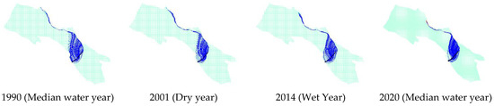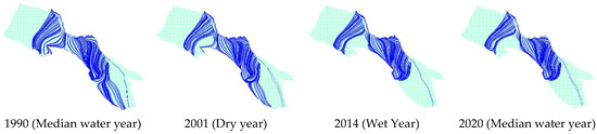 Based on the groundwater flow field in typical years, the influence area of the Heihe River was identified (Figure 6). From 1990 to 2001, due to the continuous drought in the HRB and the increase in groundwater extraction, the area affected by the recharge of the Heihe River decreased. From 2001 to 2014, the river basin turned from dry to wet, and the influence area increased. From 2014 to 2020, the HRB continued to be abundant in precipitation, and under the combined effects of mountain runoff, irrigation water diversion, and groundwater extraction, the area affected by the leakage of the Heihe River decreased slightly.