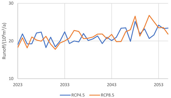 The mountain runoff of the Heihe River and other rivers is predicted according to the prediction of precipitation in the upper reaches of the HRB. Under the RCP4.5 scenario, the predicted annual runoff of Yingluoxia from 2023 to 2055 is 21.17 × 108 m3/a, and that of Yingluoxia from 2023 to 2055 is 21.46 × 108 m3/a under the RCP8.5 scenario (Figure 8).