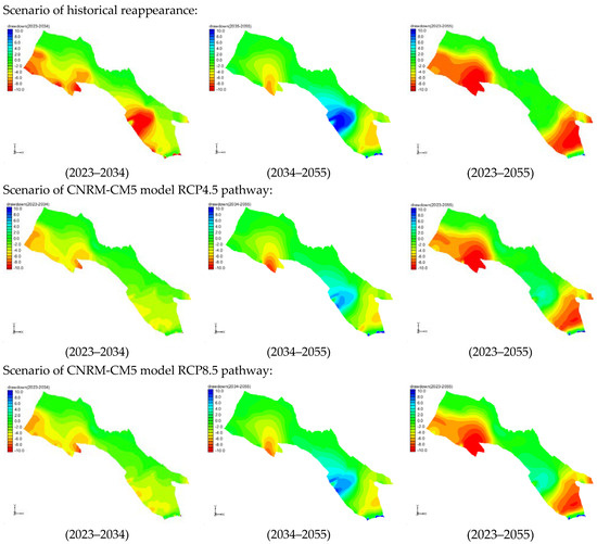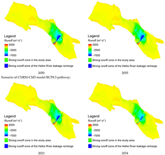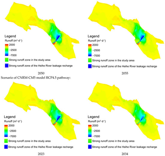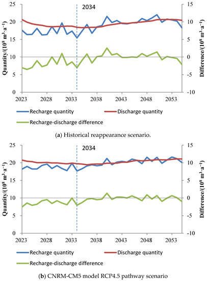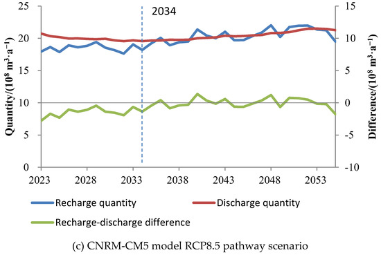 Under the predicted historical reappearance scenario, the average annual recharge of groundwater in the study area from 2023 to 2055 is 18.93 × 108 m3/a, the average annual discharge is 19.59 × 108 m3/a, and the difference between recharge and discharge is −0.66 × 108 m3/a. Under the RCP4.5 scenario, the average annual recharge of groundwater in the study area from 2023 to 2055 is 19.67 × 108 m3/a, the average annual discharge is 20.23 × 108 m3/a, and the difference between recharge and discharge is −0.56 × 108 m3/a. Under the RCP8.5 scenario, the average annual recharge of groundwater in the study area from 2023 to 2055 is 19.77 × 108 m3/a, the average annual discharge is 20.30 × 108 m3/a, and the difference between recharge and discharge is −0.53 × 108 m3/a (Figure 9).