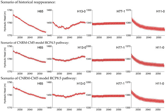Under the three scenarios, the groundwater level in the inclined plain east of the Heihe River is in a state of continuous decline from 2023 to 2055, such as in the H65 observation hole, which is due to excessive surface water diversion and reduced groundwater recharge. Under the RCP4.5 and RCP8.5 scenarios, the water resources in the future basin increased, and the decline in groundwater level was significantly lower than that of the historical reappearance scenario. The groundwater level dynamics in the Heihe River–Liyuanhe River inclined plain are mainly affected by mountain runoff, and there is a certain trend of falling first and then rising in the future (H13-0). The falling process reflects the rise of the groundwater level during the strongest flood period from 2002 to 2022, and the rising process reflects the future increase in water resources in the basin. The erosion accumulation plain is located in the groundwater discharge zone of the midstream basin, and the groundwater table is basically stable, such as in the H77-1 observation hole. The groundwater level in the Yanchi Basin continued to decline, most typically in the Southern mountainous area, mainly affected by overexploitation in the irrigation area. For example, the continuous decline of the groundwater level in the H11-0 observation hole is due to the continuous exploitation of the Luotuocheng County irrigation area. Over time, the downward trend of H11-0 water level slowed down, which was due to the increase in lateral runoff recharge of groundwater caused by the decline of the groundwater table and the increase in the hydraulic gradient around the irrigation area. The downward trends of the groundwater levels in the Yanchi basin under the RCP4.5 and RCP8.5 scenarios are slower than those in the historical reappearance scenario (Figure 10 and Figure 11).