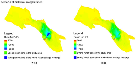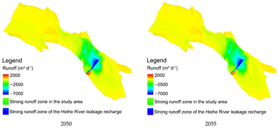 In the future, the strong groundwater runoff zone in the middle reaches of the HRB will change with the amount of water resources and human activity in the basin. In the flood year, the groundwater runoff is large, and the recharge characteristics of Heihe River leakage to groundwater are significant; in the dry year, the groundwater runoff is small, and the groundwater recharge caused by Heihe River leakage is relatively weak (Figure 12).