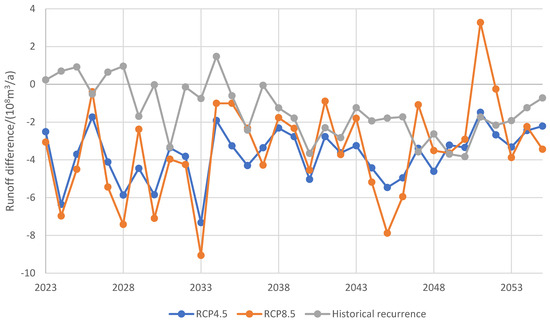 The “97 Water Diversion Plan” of the State Council stipulates the functional relationship between the runoff of Zhengyixia and Yingluoxia, so as to ensure a certain amount of runoff from Zhengyixia to the lower reaches of the HRB and safeguard the downstream ecology. Under the historical reappearance scenario, the annual average difference between the runoff of Zhengyixia and the dividing runoff amount in the future is predicted to be −1.35 × 108 m3/a. Under the RCP4.5 and RCP8.5 scenarios, the differences between the two are −3.74 × 108 m3/a and −3.48 × 108 m3/a, respectively (Figure 13). In the future, the basin will be in a wet period and will not be able to meet the “97 Water Diversion Plan” for many more years. In the previous study, with the implementation of the water-saving irrigation under the RCP4.5 and RCP8.5 scenarios, the runoff of Zhengyixia can meet the “97 Water Diversion Plan” from 2023 to 2033 continuously [4]. It is suggested that the middle reaches of the HRB further improve the level of agricultural water saving and control the reasonable scale of cultivated land to reduce the water consumption of agricultural irrigation and ensure ecological water use in the lower reaches, aiming to realize the sustainable utilization of water resources in the basin.