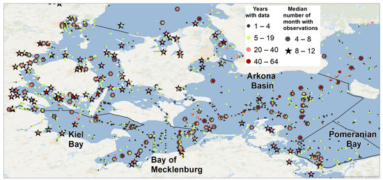 Using the available data [44,45,46,47] and the databases of local environmental agencies (LUNG-MV and LfU-SH), were able to gather oxygen data from the whole western Baltic Sea. This compiled dataset included nearly 150,000 entries and proceeded back to the beginning of the 20th century. Single observations could mostly be allocated to individual stations, which differed substantially, e.g., with respect to the number of years with available data or the number of measurements per year, resulting in strong differences in the spatial coverage of assessment units in the western Baltic Sea (see Figure 6 and Figure 8). While temporal and highly resolved stations (e.g., from the MARNET monitoring network [76]) allow short-term oxygen dynamics to be analysed, others have a lower high temporal resolution but have been monitored over six decades (e.g., along the Baltic Thalweg [22]) allowing the study of the long-term development of oxygen deficiency situations. Bringing together these different stations in a consistent way is challenging but necessary to derive the extent of areas with NBO below critical threshold concentrations.