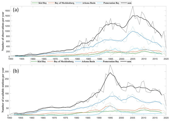 Figure 2. Number of observations (a) and number of available stations (b) per year for each assessment unit in the western Baltic Sea, where bold lines are the 5-year running means.