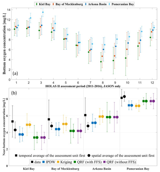 Figure 3. (a) Climatology of the near–bottom oxygen concentrations [mg/L] averaged from the available stations in the complete assessment units [43] from the HOLAS-II period (2011–2016); (b) The mean values (July to November values only) for the assessment units of HOLAS–II periods computed by first calculating the spatial average and afterward the temporal average (squares) or vice versa (dots) based purely on the observations (black) or after closing the gaps with different geostatistical methods.