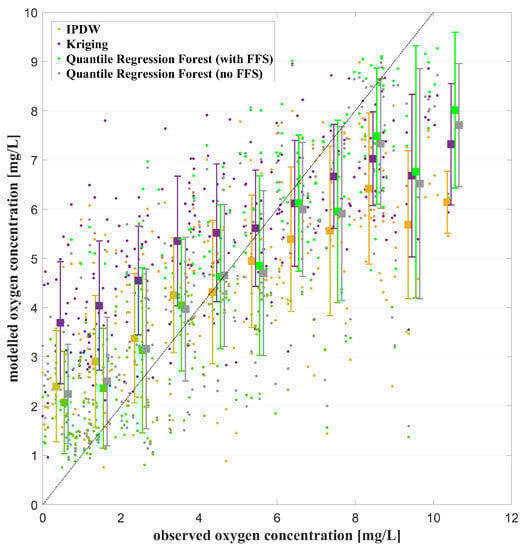 Figure 4. Comparison of the observed and model near-bottom oxygen concentrations in 2015 from the different geostatistical methods. Dots show the single measurements; squares show the means and standard deviations within ranges 0–1, 1–2, …