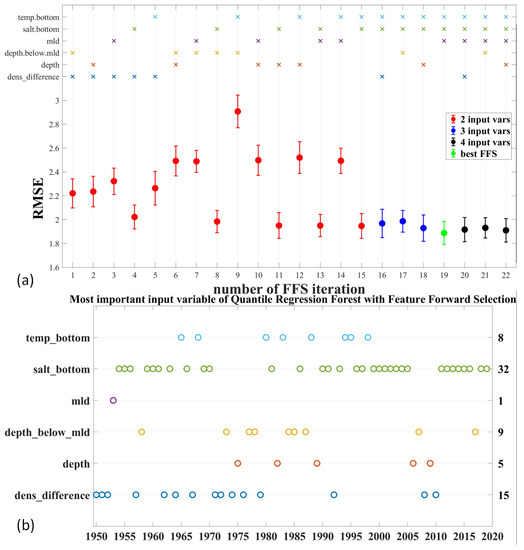 Figure 5. (a) The feature forward selection took 22 steps and gained the best QRF model (with FFS) for 2015 using bottom salinity and temperature, as well as mixed layer depth (mld); the iterative process started by testing all combinations of the two input variables (red circles). After finding the best pair, a third input variable was added (blue circles) and finally four input variables were tested (black circles); however, RMSE worsened compared to the best combination with 3 input variables (green circle); (b) The most important input variable of the QRF model with FFS for each year. The right numbers are the total quantities of each input variable over the whole time series. dens_difference is the density difference between the surface and bottom.