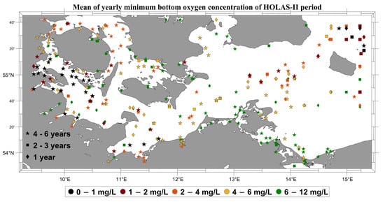 Figure 6. Mean of the yearly minima of near-bottom oxygen concentrations [mg/L] evaluated for the HOLAS–II period (2011–2016) using only data from the critical period (July to November). Different oxygen concentrations are colour coded; the different symbols indicate how many years were available for each station.