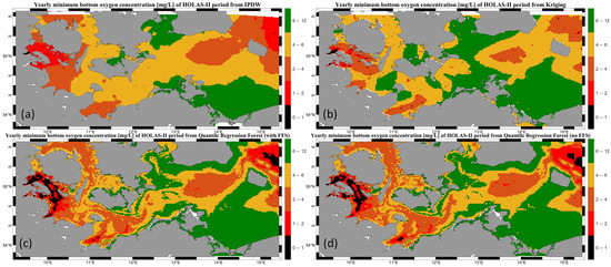 Figure 7. Mean annual minimum for the HOLAS–II period (2011–2016) of the bottom oxygen concentration [mg/L] using different geostatistical methods (a) IPDW; (b) Kriging; (c) Quantile Regression Forest with FFS; (d) Quantile Regression Forest without FFS).