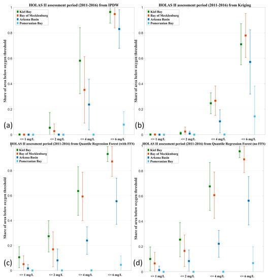 The following supporting information can be downloaded at: https://www.mdpi.com/article/10.3390/w15183235/s1, Figure S1: Number of observations and available stations per year for each assessment unit, averaged for the HOLAS-II assessment period; Figure S2: Share of years during the HOLAS-II period, when AOA was 1 at QRF, as well as the mean standard deviations from both QRF variants; Figure S3: Standard deviation of the annual minima for the HOLAS-II period (2011–2016) of the near-bottom oxygen concentration from the different geostatistical methods; Figure S4: Combination of the computed AOA and the annual standard deviations for the HOLAS-II period; Figure S5: Coherence map of the four geostatistical methods for the HOLAS-II assessment period; Figure S6: Annual RMSE of the different geostatistical methods; Figure S7 Share of years with AOA = 1; Table S1: Temporal development of the area shares below the different bottom oxygen concentration thresholds for each assessment unit from the different geostatistical methods.