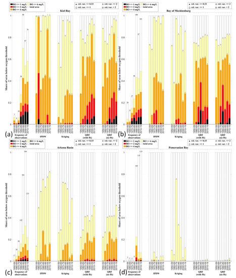 Figure 9. Temporal development of the area shares below the different bottom oxygen concentration thresholds for each assessment unit (a) Kiel Bay; (b) Bay of Mecklenburg; (c) Arkona Basin; (d) Pomeranian Bay) using the different geostatistical methods. The symbols indicate the relative variance, calculated as the standard deviation per decade divided by the mean. The first set of bars indicate the mean number of used observations per year for the different decades.