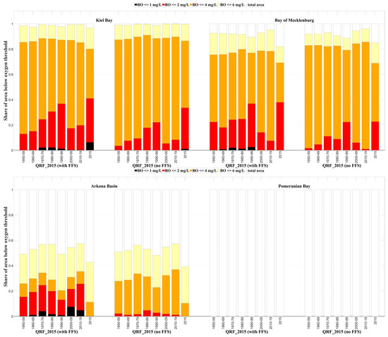 For Arkona Basin, already 4 mg/L seems a critical oxygen concentration (see Figure 3, Figure 7, Figure 8 and Figure 9), while the interpolation methods provide hardly lower NBO (see Figure 9). Therefore, 4 mg/L is depicted here as a critical threshold. The areal estimates were between 0 and 10.3% for the pre-eutrophic state in the geostatistical models, while Piehl, Friedland [25] seemed to be quite in the middle with 4.6% for the period 1960–69. This value might be a realistic estimate for the pre-eutrophic situation, but it is still quite challenging to achieve it with eutrophication pressure nowadays (see Figure 10). In Pomeranian Bay, where the oxygen situation overall is less critical, NBO concentrations below 6 mg/L can be seen as a warning signal, while lower NBO concentrations occur not without external disturbances. While Piehl, Friedland [25] estimated area shares of approx. 2%, our interpolation methods gained 0% for the pre-eutrophied decades, while the QRF models estimated higher area shares, although they seemed to overestimate NBO in Pomeranian Bay substantially (see Section 4.2).
