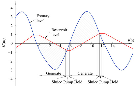 Tidal power stations have been using artificially created tidal phase differences and flowing through turbines to generate electricity for a relatively long time [6,7]. Early studies on tidal power stations focused on traditional one-way or two-way operations without a pump mode [8,9,10]. However, as tidal power stations have further developed, scholars have studied the potential energy gains that can result from the pump mode [11,12]. Yates et al. [12] found that the pumped energy gain is 6% at best with the addition of finite flow velocities, finite turbine and sluice capacities, and the same turbine and pump efficiencies. Reversible pump-turbines allow for greater flexibility in energy generation and storage, as they can pump water during low-demand periods and release it during high-demand periods to generate electricity [13]. The sea level rises and falls twice a day in most regions, with an average interval of approximately 12 h 25 min between the two tides. The change in sea level in a day is roughly like a sine wave, and the tidal power station will adjust the reservoir water level to generate power according to the change in sea-water level. Most of the current units used in tidal power plants are reversible pump-turbines, which have six functions, including two-way power generation, two-way pumping, and two-way sluice, as shown in Figure 1 [9]. This helps to balance the grid and ensure a steady supply of energy. However, the design and operation of these pump-turbines can be complex and require careful management to ensure their efficient and safe operation.