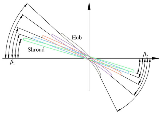 In this paper, we adopted the asymmetric blade design method, in which the β1 and β2 shown in Figure 2 are not equal. The front and rear impellers for the same hydraulic model mirror relationship, which can ensure the consistent performance of the forward and reverse working conditions, that is, to meet the requirements of a two-way operation. Table 1 shows the design parameters of the test pump, which uses a two-way design that eliminates the need to distinguish between flood and ebb modes during the simulation process for the impellers. The hydraulic model design parameters in Table 1 were designed using the streamline method and adopted an asymmetric design approach. Among them, the shroud and hub of the pump-turbine are both designed with cylindrical surfaces.