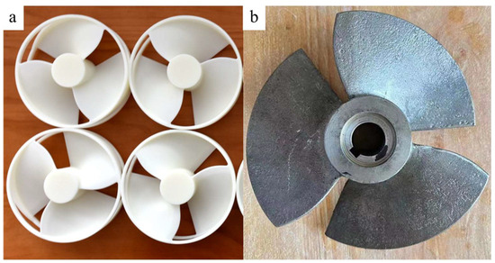To test and verify the design parameters, the test pump was manufactured according to the specified proportions. Figure 3a displays the impeller mold that was created using 3D-printing technology. A protective ring was installed around the impeller to ensure that the cast blade was accurate. This step is crucial in ensuring that the test results are reliable and can be used to make informed decisions about the design of the pump. Figure 3b shows the finished impeller.