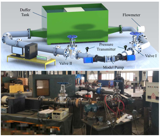 The experimental setup used in this research is a multi-functional testbed designed and built by the Fluid Mechanical Engineering Research Center of Jiangsu University and Jiangsu National Pump Co., Ltd (China, Jiangsu, Zhenjiang). The experimental setup includes a model pump, a buffer tank, valves I and II (gate valves), an electromagnetic flowmeter, two pressure sensors, and the corresponding pipeline. A schematic of the experimental setup is depicted in Figure 4.