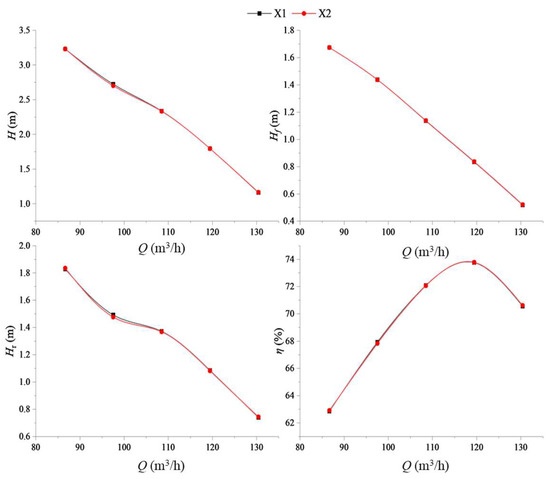 The grid scale near the wall was maintained, and the number of grids in the whole area was controlled by the maximum grid scale. Finally, two groups of schemes with the number of grid nodes being 31.25 million and 23.9 million, respectively, are obtained, which are named X1 (with 31.25 million grids) and X2 (with 23.9 million grids). On this basis, steady numerical simulation calculations were carried out on the two schemes, respectively, and the characteristic curves near the rated flow (108 m3/h) were obtained (shown in Figure 6). The computational machine we used has 2 intel Gold 6238R CPUs and 128 GB of RAM. When the 56 cores of the CPU are invoked, it takes about 8 h to complete a numerical simulation.