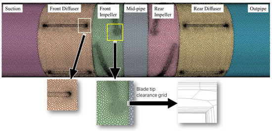 Figure 7 shows the grid display of each region of X2. Mesh encryption is adopted on the inlet edge and the outlet edge of the guide vane blade and impeller blade, to ensure that the actual shape of the relevant region can be restored more accurately when the geometric domain is converted into a grid respectively. In addition, the tip area of the impeller blade is also encrypted, and the wall mesh near the tip gap adopts a lower mesh growth rate, and the number of mesh layers in this area is more than 25.