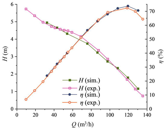 Figure 8 shows the experimentally and numerically obtained Q–H curve and Q–η curve under pump mode. In the area of large flow rate, the simulated value will be slightly higher than the experimental value. However, the simulated value will be slightly lower than the experimental value in the low flow-rate area. The efficiency point obtained by numerical simulation is slightly higher than that obtained by experiment in the area of large flow rate. In general, the experimental data are close to the simulated data and have the same variation trend.