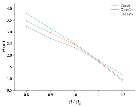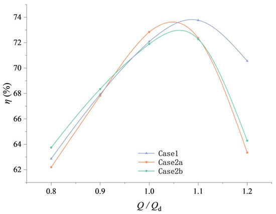 The Q–H curves of the different cases under the pump mode are shown in Figure 9. The Q–H curves of the different cases intersect near a flow rate of 119 m3/s. At low flow rates and rated flow rates (Q ≤ 108.5 m3/s), the head of Case2 is greater than that of Case. However, at high flow rates (Q > 108.5 m3/s), the head of Case2 is smaller than that of Case1. This means that when the blade count of a stage impeller of a contra-rotating axial-flow pump-turbine is increased, its Q–H curve becomes steeper. In all calculation conditions, the head of Case2b is greater than that of Case2a. This means that increasing the blade count of the rear impeller improves the head more than increasing the blade count of the front impeller.