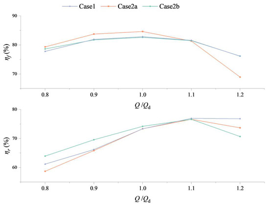 The Q–ηf/ηr curves of two-stage impellers of different cases under pump mode.