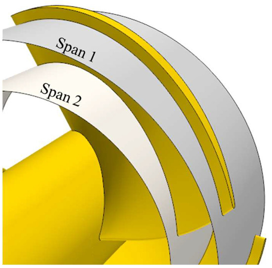 Pump hydraulic performance and energy transfer characteristics will be significantly affected by changes in the flow pattern [28]. Figure 14 shows a schematic diagram of the impeller span surface. Span 1 represents a cylindrical surface with Span = 0.95, and Span 2 represents a cylindrical surface with Span = 0.6.