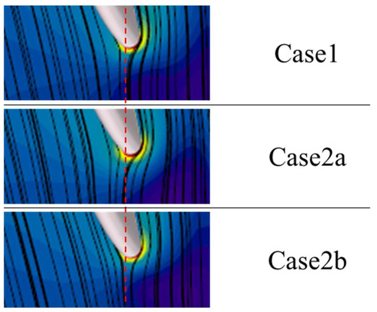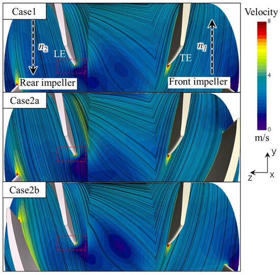 Figure 15 shows the streamlines of the Span 2 impeller flow field under the rated flow rate (Q = 108.5 m3/s) for the different cases. In the front impeller, it is difficult to observe significant differences in the streamlines. The red dashed box in Figure 15 represents the area near the LE (leading edge) of the secondary impeller, which is enlarged and shown in Figure 16 for better observation of the impact position of the fluid on the LE of the rear impeller. A red dashed line is added as a reference for the impact position. Compared with Case1, the impact position of Case2a shifts downstream, which is the main reason for the increase in the Pr of Case2a. When the two-stage impellers maintain the same speed, the impact position of the fluid on the rear impeller is not ideal. The impact position of Case2b shifts slightly upstream, which is actually beneficial for the impeller to work. However, the increase in blade count leads to an increase in power, so although the power of the rear impeller of Case2b is higher, its efficiency is not much different from that of Case1.