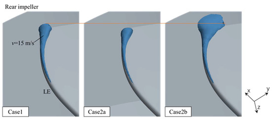 To further investigate the flow characteristics of the two-stage impellers, this study extracted the velocity iso-surfaces of 11.5 m/s inside the front impeller and 15 m/s inside the rear impeller, as shown in Figure 17 and Figure 18, respectively. The higher velocity regions are mainly located on the suction surface near the LE of each stage impeller. In Figure 17, the 11.5 m/s velocity iso-surface of Case2a is significantly smaller than that of the other two cases, indicating that increasing the blade count of the front impeller can reduce the high-velocity region of the front impeller. Comparing this with Figure 12, it can be found that the efficiency ηf of the front impeller of Case2a is the highest at this condition. In Figure 18, the 15 m/s iso-surface area of Case2b is the largest. Comparing this with Figure 16, as the position of the fluid impact on the LE shifts downstream, the area of the 15 m/s iso-surface gradually decreases.