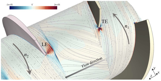 Figure 19 shows the contours of vorticity on Span 2 in Case1. Due to the large distance between Span 2 and the tip-clearance area, the change of vorticity caused by tip-clearance leakage cannot be observed. The vorticities are primarily a result of flow separation caused by the impact of water on the LE of the two-stage impeller, as well as vortices formed by the wake of the TE (trailing edge). However, the large contours of vorticity are not observed in the region between the two-stage impeller, so the focus of the next analysis is mainly on the inner region of the two-stage impeller. Ali Tafarojnoruz et al. found that downstream of the cylinder, the influence of the wake from the top of the cylinder is mainly limited to the area near the top of the cylinder, while the influence of the separated shear layers (SSLs) from the side of the cylinder dominates in a larger area, and the vorticity intensity related to the wake is mainly significant in the “very near wake” region [29].
