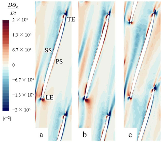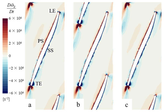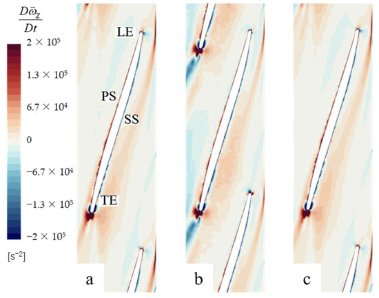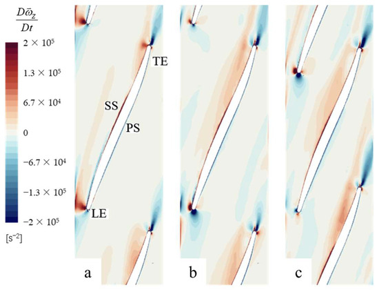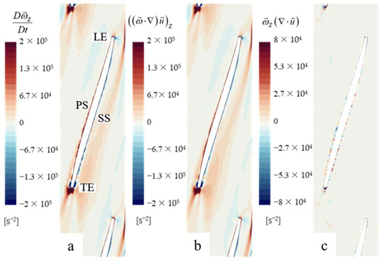 Figure 20 displays the contours of the vorticity and each term on Span 1 of the front impeller. Notably, there is a region near the SS (suction surface) of the blade with a large absolute value of significant vorticity, which is located in close proximity to the tip clearance of the impeller. Along the flow direction, there is a trend of gradual diffusion in this area. This is due to vorticity caused by blade-tip leakage. As shown in Figure 20, the vorticity in this area is mainly dominated by the vortex stretching term, which means that the vortex deformation here is relatively severe. In addition, there are obvious vortices in the LE region, which are generated by the impact of the fluid on the LE. There is a region with a small value of vorticity near the PS (pressure surface) in the LE, which is a continuation of the vortex caused by impact downstream and gradually dissipates in the flow. Comparing Figure 20a with Figure 20b, only a slight difference near the blade is observed. That is, in the region near the tip of the blade, the vortex stretching term in the vorticity transport equation is dominant. The contours of the vorticity caused by the vortex stretching term is mainly located near the blade surface and in the wake near the TE.