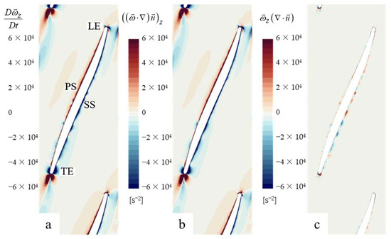 Figure 21 shows the contours of the vorticity and each term on Span 2 of the front impeller. At this time, the regions with a large absolute value of significant vorticity are mainly in the wake regions near the LE and the TE. There is a region with a small value of vorticity near the blade surface in Figure 21, which means that the vortex stretching term still dominates the vorticity transport equation at this time.