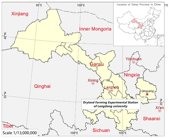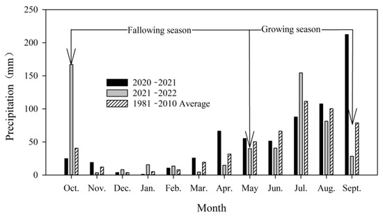 The experimental site is located in the Dryland Farming Experimental Station of Longdong University (35°43′ N, 107°41′ E, altitude 1421 m) (Figure 1), Xifeng District, Qingyang City, Gansu Province, China, which belongs to the gully area of the Longdong Loess Plateau. It belongs to a temperate continental semi-arid climate, with annual average temperatures of 8~10 °C [21], and annual average precipitation of 527.6 mm (precipitation data from Qingyang Meteorological Bureau) (Figure 2). The precipitation is concentrated in July~September, the interannual change rate is large [3]. The average annual pan evaporation is 1504 mm [21]. The total annual sunshine is 2400~2600 h, and the effective active accumulated temperature of ≥5 °C is 3445 °C. The annual frost-free period is 150~190 days [30], and the precipitation amounts in 2021 and 2022 were 796.4 and 449.6 mm, respectively (precipitation data from Qingyang Meteorological Bureau) (Figure 2). The soil is classified as Heilu (a very deep loess sandy loam of the Los Orthic Entisols) based on the FAO soil classification. The average soil bulk density was 1.23 g/cm3, the soil organic matter content of 0–30 cm in the test site was 12.08 g/kg, the alkaline hydrolyzable nitrogen was 75.5 mg/kg, the available phosphorus was 19.21 mg/kg, and the available potassium was 140.85 mg/kg in 2021. It was maize monoculture in 2020, 2021, and 2022.