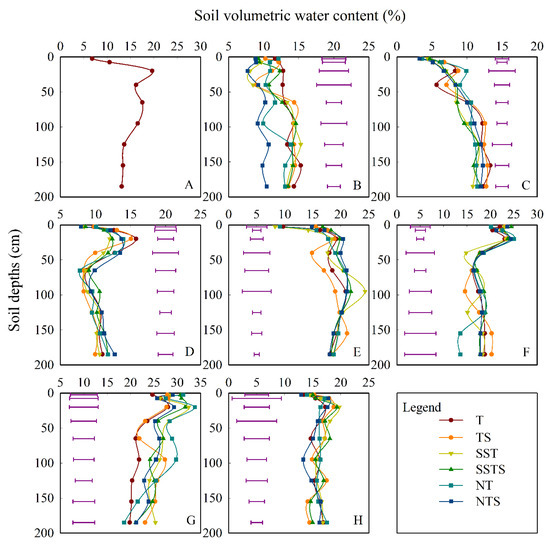 Soil volumetric water content (SWv) varied with year, tillage practice, soil depth, and growth stage of maize (Figure 3). Compared to T, SWv with TS was not affected significantly in 2021 (Figure 3A–D), but with TS it was significantly increased in the 0–5 cm depth before the sowing of maize (Figure 3E), and in the 110–140, 140–170 cm soil layers at the R2 stage, but with TS it was significantly decreased in the 80–110 cm soil layer at the R2 stage (Figure 3G) and at 170–200 cm at after harvest (Figure 3H) in 2022. Compared to T, SWv with SST was significantly increased in the 30–50 cm soil layer at the R2 stage (Figure 3C), but with SST it was significantly reduced in the 10–30 cm soil layer at the V12 stage (Figure 3B) and after harvest (Figure 3D). In 2021, SWv with SST was significantly increased in the 50–80, 110–140, and 170–200 cm soil layers at the R2 stage (Figure 3G), but with SST it was significantly reduced in the 5–10 cm soil layer before sowing (Figure 3E) in 2022. Compared to T, the SWv with SSTS was significantly increased in the 30–50 cm soil layer, but with SSTS it was significantly reduced at 80–110 and 140–170 cm at the R2 stage (Figure 3C); the SWv with SSTS was significantly reduced in the 10–30 cm soil layer after harvest (Figure 3D), in 2021. Compared to T, the SWv with SSTS was significantly increased in the 0–5 and 5–10 cm soil layer before sowing (Figure 3E), the SWv with SSTS was significantly increased in 5–10 cm soil layer at the V2 stage (Figure 3F), and the SWv with SSTS was significantly increased in the 0–5, 50–80, and 110–140 cm soil layers at the R2 stage (Figure 3G), in 2022. Compared to T, the SWv with NT was significantly reduced at the 140–170 cm soil layer at the V12 stage (Figure 3B), the SWv with NT was significantly increased in the 30–50 cm soil layer, but significantly reduced at 80–110 and 140–170 cm at the R2 stage (Figure 3C), in 2021. Compared to T, the SWv with NT was significantly increased, and there was no significant difference in other treatments in the 10–30 cm soil layer at the V12 stage (Figure 3F). The SWv with NT was significantly increased in the 0–5, 50–80, and 110–140 cm soil layers, but with NT it was significantly decreased in the 80–110 cm soil layer at the R2 stage (Figure 3G), in 2022. Compared to T, the SWv with NTS was significantly reduced in the 5–10, 10–30, 50–80, 110–140, and 170–200 cm soil layers at the V12 stage (Figure 3B). The SWv with NTS was significantly increased in the 30–50 cm soil layer, but significantly reduced at 5–10 cm at the R2 stage (Figure 3C), in 2021. Compared to T, the SWv with NTS was significantly increased in the 0–5 cm soil layer before the sowing of maize (Figure 3E), and the SWv with NTS was significantly increased in the 50–80 cm soil layer at the R2 stage (Figure 3G), in 2022.