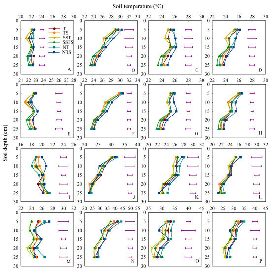 Effect of tillage practices on soil temperature in the 5, 10, 15, 20, 25 cm soil layers at 8:00 a.m. of V12 in 2021 (A) and 2022 (I), at 14:00 p.m. of V12 in 2021 (B) and 2022 (J), at 18:00 p.m. of V12 in 2021 (C) and 2022 (K), daily average of V12 in 2021 (D) and 2022 (L), at 8:00 a.m. of R2 in 2021 (E) and 2022 (M), at 14:00 p.m. of R2 in 2021 (F) and 2022 (N), at 18:00 p.m. of R2 in 2021 (G) and 2022 (O), daily average of R2 in 2021 (H) and 2022 (P). T, conventional tillage with no straw; TS, conventional tillage with straw incorporated; SST, subsoiling tillage with no straw; SSTS, subsoiling tillage with straw incorporated; NT, no-till with no straw; NTS, no-till with straw cover. The short line in the figure is LSD bar (p ≤ 0.05).