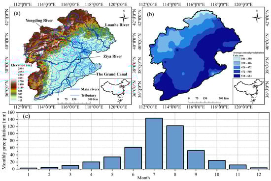 Topographic and geographic zones in the Haihe River Basin (a); spatial distribution of annual average precipitation in the Haihe River Basin (b); monthly precipitation in the Haihe River Basin (observation period from 1961 to 2014) (c).