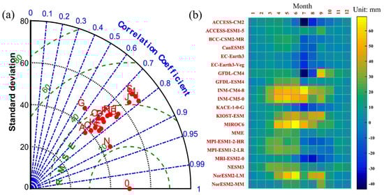 Statistical performance differences of observed and simulated precipitation in the Haihe River Basin from the CMIP6 models (including multi-model ensembles (MME)) based on Taylor diagrams (a). The error of precipitation in different months between the CMIP6 models and observations from 1961 to 2014 (b). Note: the darker the blue, the smaller the numerical value; The darker the yellow, the greater the numerical value.