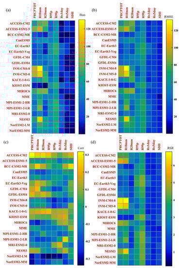 Statistical performance differences of observed and simulated extreme precipitation in the Haihe River Basin for CMIP6 models (including MME) based on the thermodynamic diagram. (a–d) represent, respectively, Bias, RMSE, correlation coefficient, and RSR. Note: the darker the blue, the smaller the numerical value; The darker the yellow, the greater the numerical value.