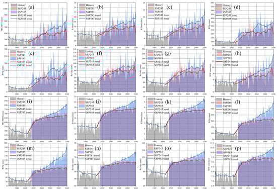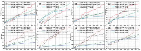 The precipitation trends of BCC-CSM2-MR and MME were analyzed based on the change trends shown in Figure 4. Figure 4a–h reveal that BCC-CSM2-MR predicts a clear increase in both annual and extreme precipitation over the Haihe River Basin in the future. The annual and extreme precipitation fluctuated significantly in the Haihe River Basin. In addition, annual and precipitation data in the BCC-CSM2-MR model demonstrated a similar increased trend between 2015 and 2050 under the SSP245 and SSP585 scenarios. The annual and extreme precipitation of the BCC-CSM2-MR model under the SSP585 scenario demonstrated a higher increasing trend than did the SSP245 scenario between 2050 and 2100. As shown in Figure 4d,e, R95p and R99p demonstrated clear peaks between 2050 and 2080 under the SSP585 scenario. Figure 4i–p shows that MME also predicts a clear increase in both annual and extreme precipitation over the Haihe River Basin in the future. The MME model predicted that annual and extreme precipitation would clearly increase in the future. The annual and extreme precipitation in the MME model demonstrated a similar increasing trend between 2015 and 2050 under the SSP245 and SSP585 scenarios. The annual and extreme precipitation of the MME model under the SSP585 scenario demonstrated a higher increasing trend than the SSP245 scenario between 2050 and 2100. Historical, annual, and extreme precipitation demonstrated stable fluctuations in the Haihe River Basin. Overall, both the BCC-CSM2-MR and MME models predict significant increases in precipitation in the Haihe River Basin in the future.