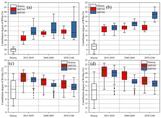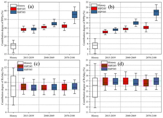Degree of contribution of extreme precipitation in different time periods (historical: 1961–2014, and future: 2015–2039, 2040–2069, and 2070–2100), based on the BCC-CSM2-MR model in the Haihe River Basin, where (a), (b), (c), and (d) represent R95p, R99p, Rx1day, and Rx5day, respectively.