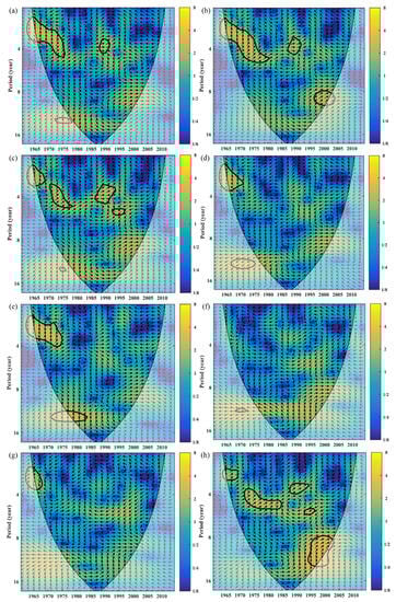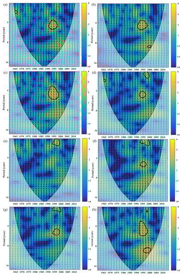 The cross-wavelet transforms between the ENSO and historically observed extreme precipitation in the Haihe River Basin. (a), (b), (c), (d), (e), (f), (g), and (h) represent, respectively, PRCPTOT, R10mm, R20mm, R95p, R99p, Rx1day, Rx5day, and SDII. The thick black contour denotes the relationships that are significant against the red noise at the 95% confidence level. The cone of influence (COI), where edge effects might distort the picture, is shown in lighter shades. The relative phase relationship is indicated by the arrow direction (with anti-phase pointing left and in-phase pointing right). The color bar on the right denotes the wavelet energy.