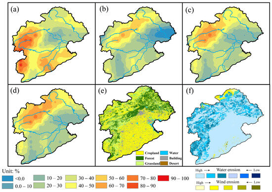 Degree of Rx5day changes in extreme precipitation from 2025 to 2035 in the Haihe River Basin under SSP245 and SSP585. BCC-CSM2-MR model under SSP245 (a), BCC-CSM2-MR model under SSP585 (b), MME model under SSP245 (c), and MME model under SSP585 (d). Land-use type (e), and soil erosion (f) in the Haihe River Basin, based on remote sensing technology.