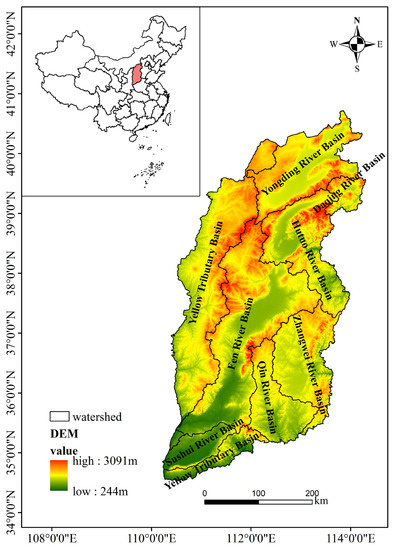 Shanxi Province (34°34′–40°44′ N, 110°14′–114°33′ E) in North China has a total area of 15.67 × 104 km2 (Figure 1). This area comprises various landforms, such as mountains, hills, plateaus, and basins. Mountains and hills account for 80% of the total area of the province; the terrain is high in the northeast and low in the southwest. It has a temperate continental monsoon climate and an uneven seasonal distribution of precipitation, with more precipitation in summer and fall and less precipitation in winter and spring. Shanxi Province spans two major water systems, the Yellow and Hai Rivers, with a total annual average water resource of 180.59 × 108 m3, of which the Yellow River Basin includes the basins of the Fen, Yellow Tributary, Sushui, and Qin Rivers; and the Hai River Basin includes the basins of the Yongding, Hutuo, Zhangwei, and Daqing Rivers.