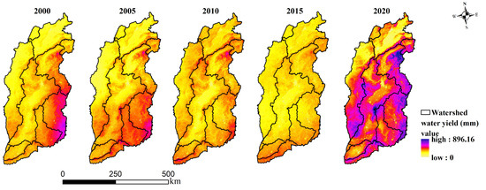 The water yield in Shanxi Province from 2000 to 2020 showed an N-shaped change, characterized by a small increase, then a decline and a subsequent increase (Figure 2). The average water yield in Shanxi Province in 2000 was 297.01 mm, and the high-value areas of water yield were mainly located in the Qin, Zhangwei, and Hutuo River Basins in the eastern part of Shanxi, owing to their abundant precipitation. However, 2015 was a very strong El Niño year; the province’s precipitation was only 480.60 mm, the average temperature was 1 °C higher than normal, and, therefore, the water yield was low at only 265.27 mm. In contrast, 2020 was the subsequent year of El Niño, when the rainfall reached 877.2 × 108 m3, with an average rain depth of 561.3 mm; thus, the year had a biased abundance of water [46]. Meanwhile, with the rapid development of the local society and economy and the popularization and implementation of the policy of “returning farmland to forests,” the expansion of construction land has occupied a large amount of arable land and grassland. Furthermore, the increase in construction land from 2000 to 2020 was 106.22%, which has greatly increased the area of impermeable layers. Consequently, the average water yield of the province in 2020 reached 375.80 mm, which was higher than that of 2000 and 78.79 mm higher than the average water yield in 2000.