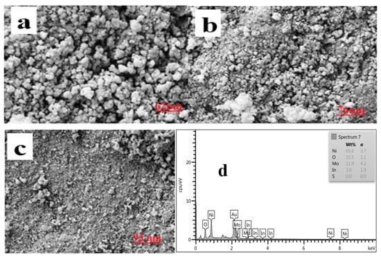 SEM images of (a) In2O3, (b) In2O3/NiO, (c) In2O3/NiO/MoS2, and (d) EDS spectrum of In2O3/NiO/MoS2.