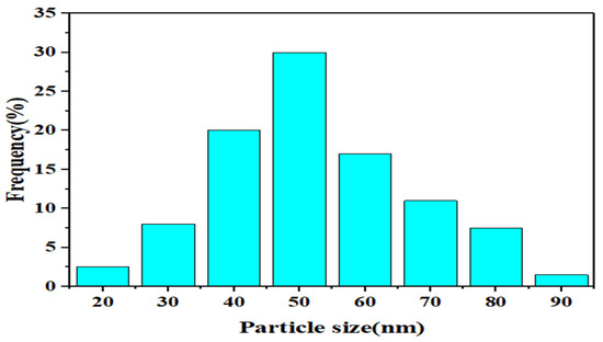 As shown in Figure 3, the particle size distribution of In2O3/NiO/MoS2 was measured using DLS. As can be seen, the range of particle size distribution was in the range of 20–90 nm.